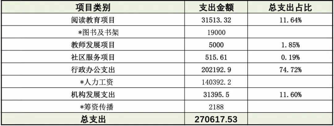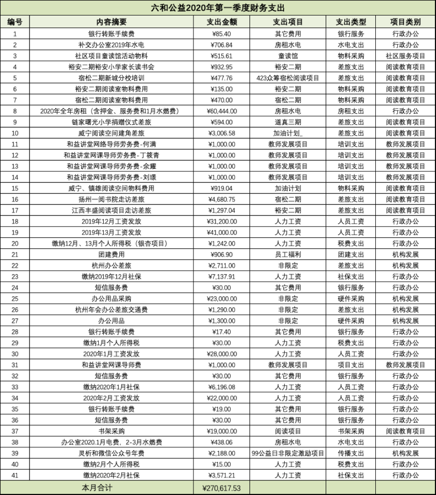 第一季度累计支出279617.53元,由于春节寒假和受疫情影响,项目支出的费用占比较少,行政办公占比最多,达到75%,主要是4个月的人力工资和办公室租金。
