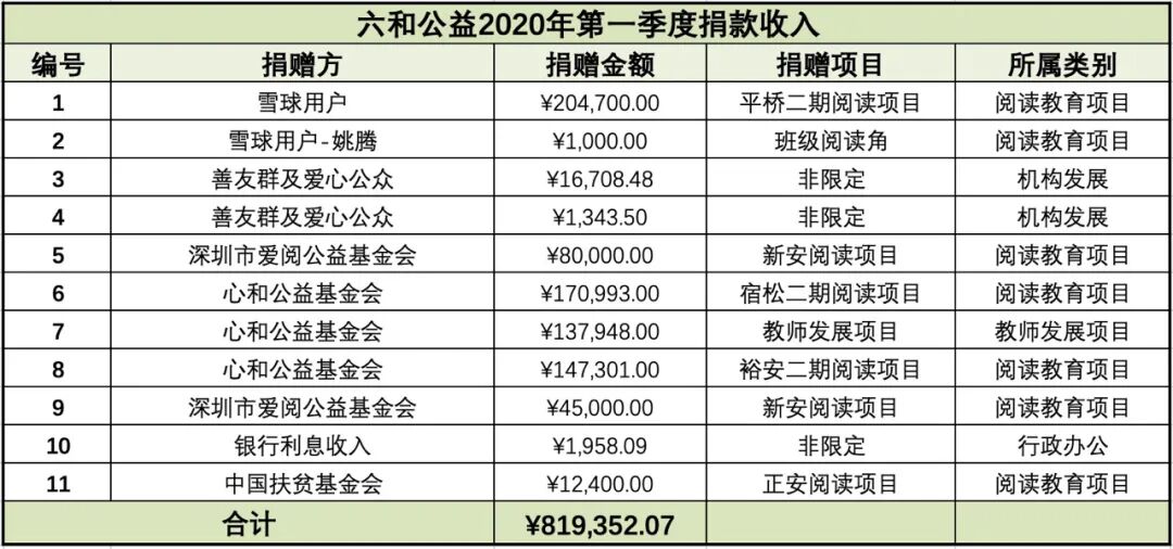 第一季度收到10笔捐款,包括雪球用户捐赠的平桥二期阅读项目拨款,心和公益基金会的3笔项目二次拨款,爱阅公益基金会的项目二次拨款,中国扶贫基金会对正安阅读项目的捐款和部分爱心公众的捐款等。